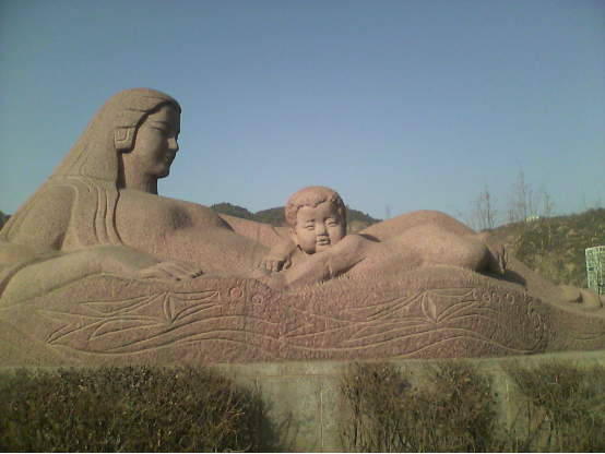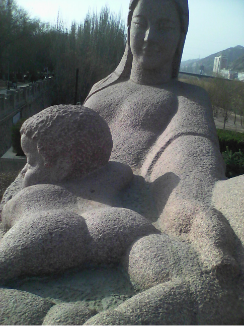 在甘肅蘭州黃河南岸的濱河路中段,有一座“黃河母親”雕塑,它由甘肅雕塑家何鄂女士創(chuàng)作,長6米,寬2.2米,高2.6米,總重40余噸,由“母親”和一“男嬰”組成構(gòu)圖。分別象征了哺育中華民族生生不息、不屈不撓的黃河母親,和快樂幸福、茁壯成長的華夏子孫。雕塑下基座上刻有水波紋和魚紋圖案,源自甘肅古老彩陶的原始圖案。