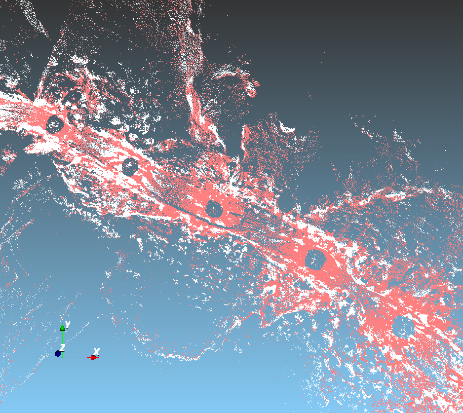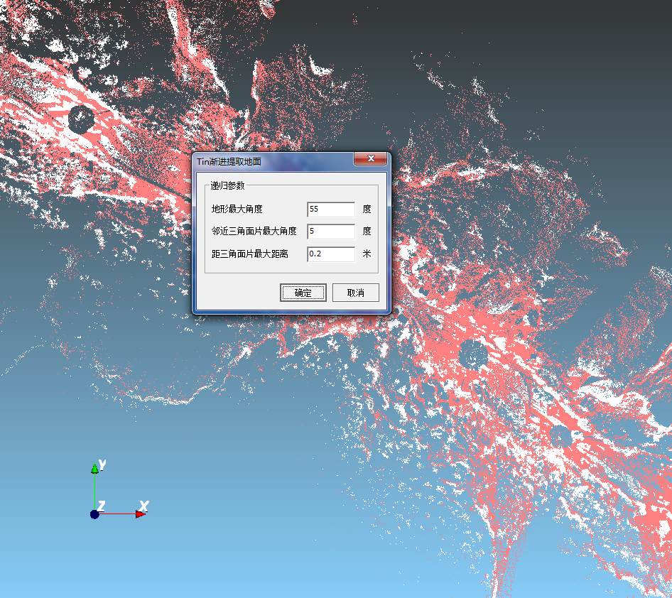 分類后點云數(shù)據(jù),紅色為地面點,白色為噪聲點