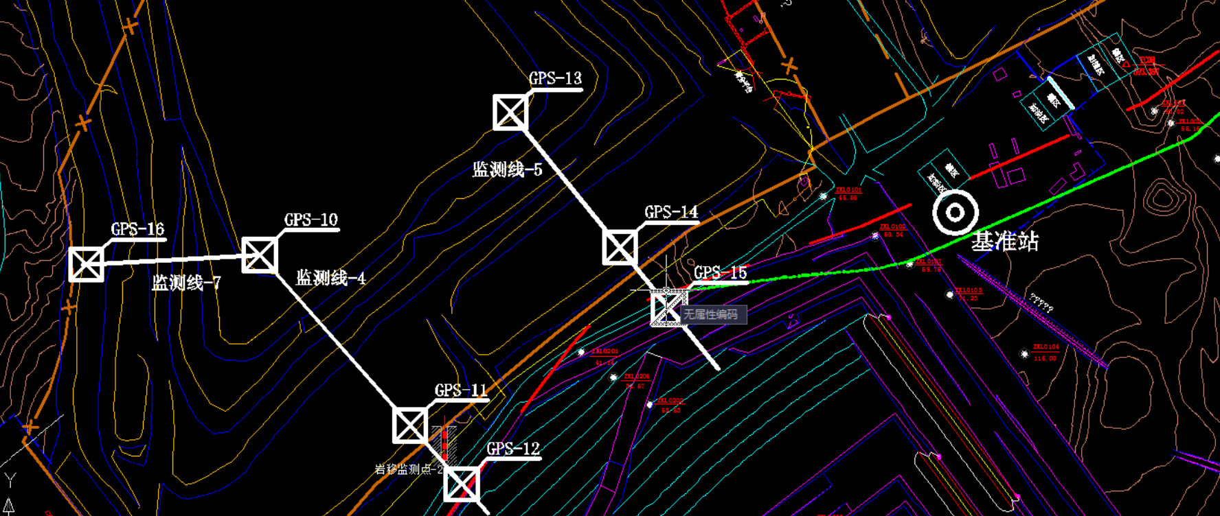 為了保證該露天礦的安全生產(chǎn),項(xiàng)目總共布設(shè)了16個(gè)GPS監(jiān)測(cè)點(diǎn),主要分布在西幫和東幫,基準(zhǔn)點(diǎn)建在距離管理中心穩(wěn)定可靠的基巖處。