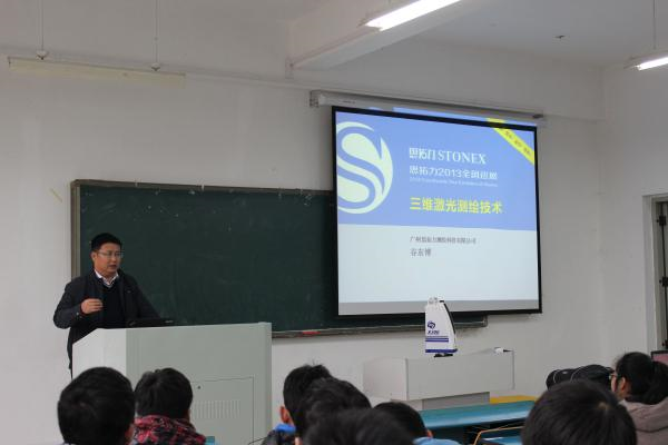 2013年12月16日下午,應(yīng)城建與環(huán)境學(xué)院測繪工程實驗室邀請,廣州思拓力測繪科技有限公司總工程師谷東博,思拓力公司安徽服務(wù)中心總經(jīng)理李耀洲等一行5人,到學(xué)校為正在進行“3S”技術(shù)實習(xí)的2011級地理信息科學(xué)專業(yè)的同學(xué)作了一場《三維激光測繪技術(shù)》專題講座。