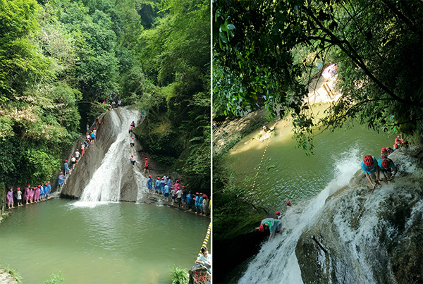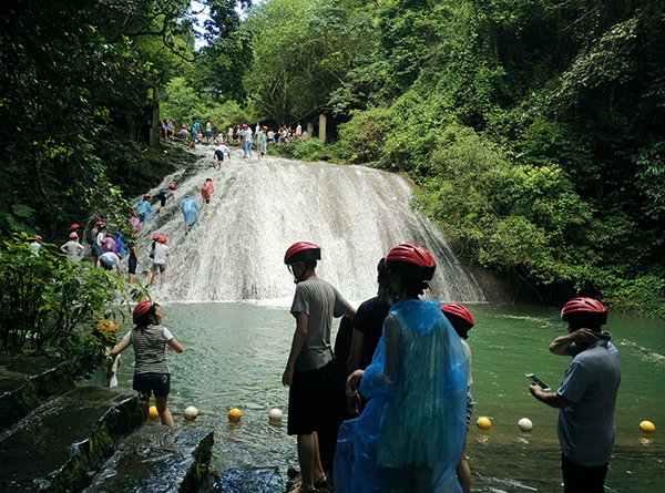 在古東瀑布,大家?guī)е^盔,腳穿草鞋,體驗(yàn)真正的走瀑戲浪。▼