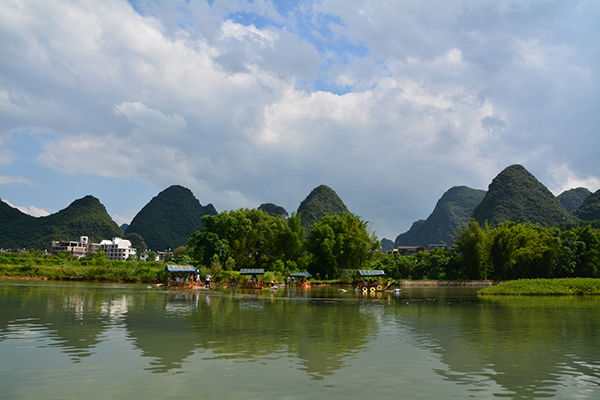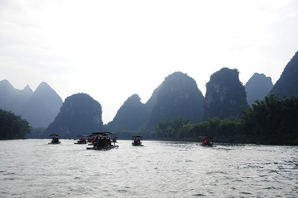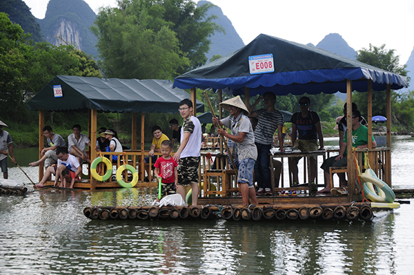 在漓江里,坐著竹筏,感受“人在畫中游“,看青峰倒影,任微風(fēng)拂面。▼