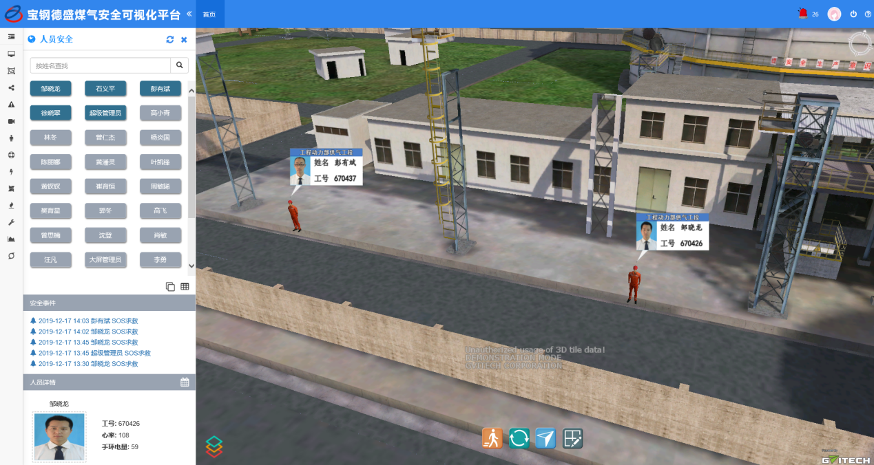 然后,通過(guò)虛擬算法在三維可視化管理平臺(tái)里實(shí)時(shí)呈現(xiàn)每位巡檢人員的信息,包括人員行走狀態(tài)與位置、歷史軌跡查詢(xún)、人員位置與監(jiān)控視頻自動(dòng)聯(lián)動(dòng),以及SOS報(bào)警觸發(fā)視頻監(jiān)控自動(dòng)尋找、報(bào)警位置自動(dòng)上傳等,以最快的響應(yīng)速度保障巡檢人員的生命安全。