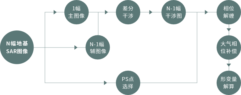 雷達(dá)設(shè)備基于SAR原理首先獲得被測(cè)區(qū)域的雷達(dá)二維圖像,將先后獲得的多幅雷達(dá)圖像序列進(jìn)行配準(zhǔn)后,系統(tǒng)完成永久散射點(diǎn)(PS點(diǎn))選擇、相位提取、相位解纏繞、相位校正、形變量解算及時(shí)間空間濾波等處理,系統(tǒng)可以獲得被測(cè)區(qū)域各空間位置的形變信息,并經(jīng)地理信息融合、三維圖形轉(zhuǎn)化、自動(dòng)報(bào)表生成、預(yù)警與告警處理等,將形變信息、告警信息以不同形式提交給用戶。