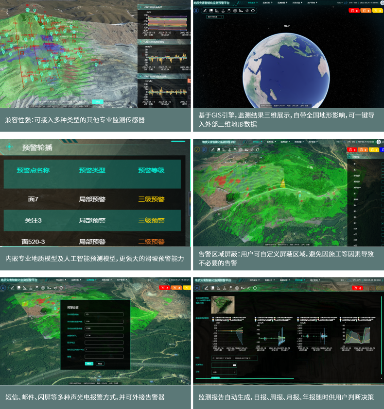 思微系列邊坡形變監(jiān)測(cè)雷達(dá)(地基差分干涉雷達(dá))基于合成孔徑(SAR)成像和差分干涉測(cè)量原理,可以在全天時(shí)全天候條件下,采用非接觸方式對(duì)滑坡、危巖、壩體等風(fēng)險(xiǎn)區(qū)域地表形變進(jìn)行大范圍高精度監(jiān)視測(cè)量,測(cè)量結(jié)果可以三維圖形方式在用戶端顯示并根據(jù)用戶需求自動(dòng)生成相關(guān)報(bào)表,結(jié)合用戶設(shè)置告警參數(shù),系統(tǒng)可以通過(guò)聲、光、短消息等方式向用戶發(fā)出警告。