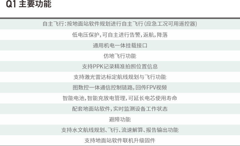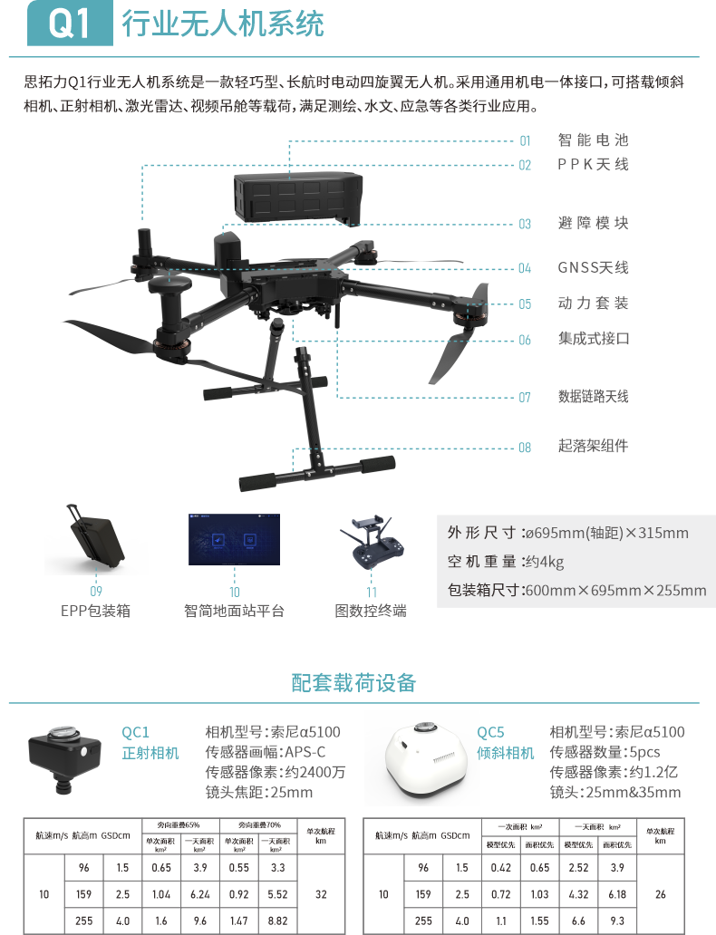 思拓力Q1行業(yè)無人機(jī)系統(tǒng)是一款輕巧型、長(zhǎng)航時(shí)電動(dòng)四旋翼無人機(jī)。采用通用機(jī)電一體接口,可搭載傾斜相機(jī)、正射相機(jī)、激光雷達(dá)、視頻吊艙等載荷,滿足測(cè)繪、水文、應(yīng)急等各類行業(yè)應(yīng)用。