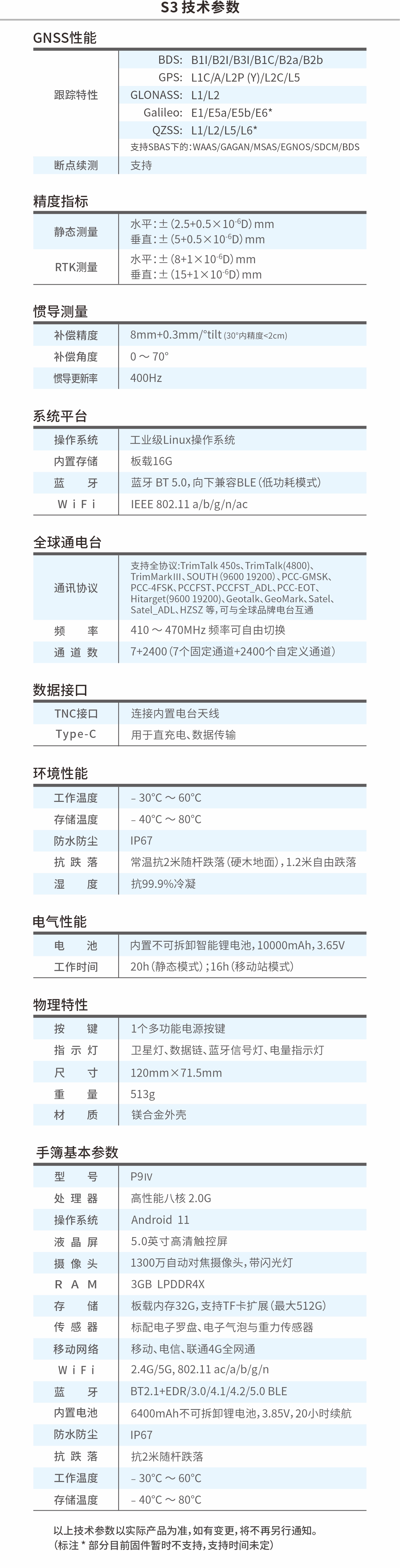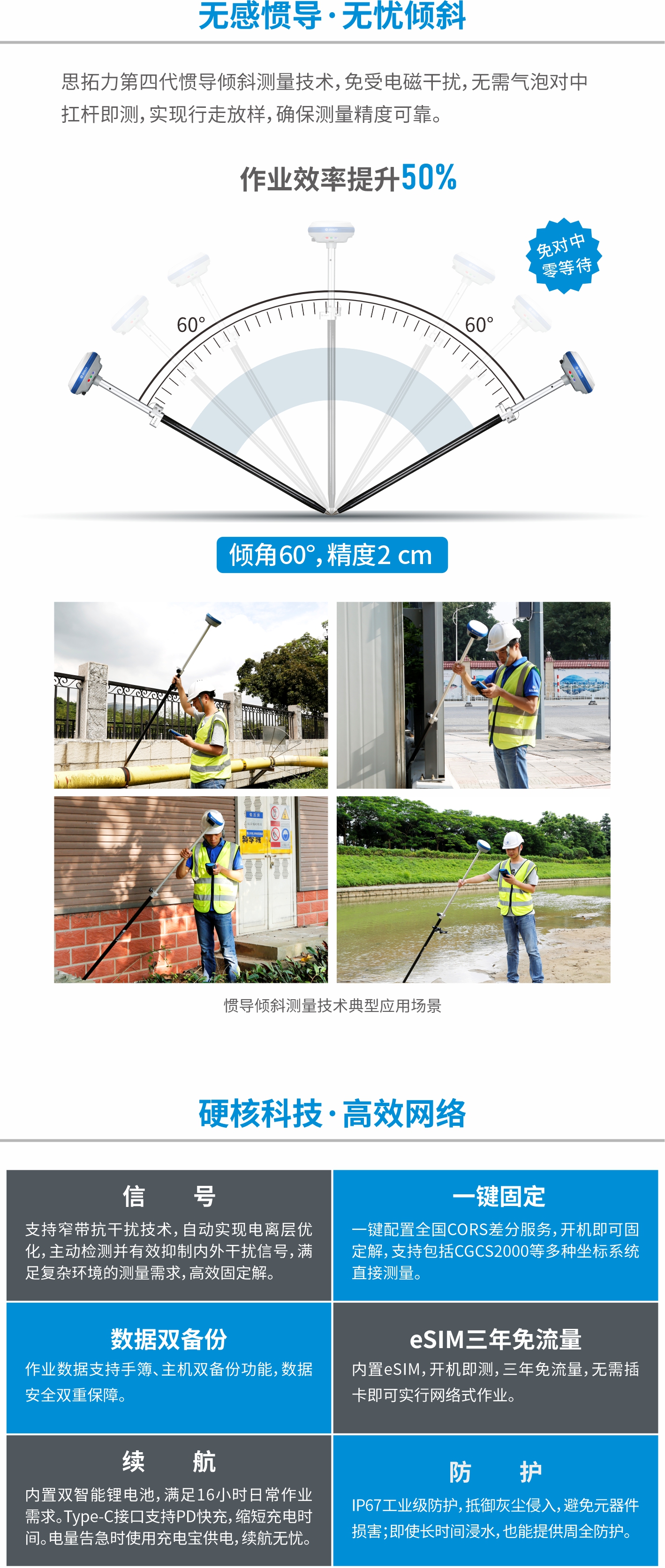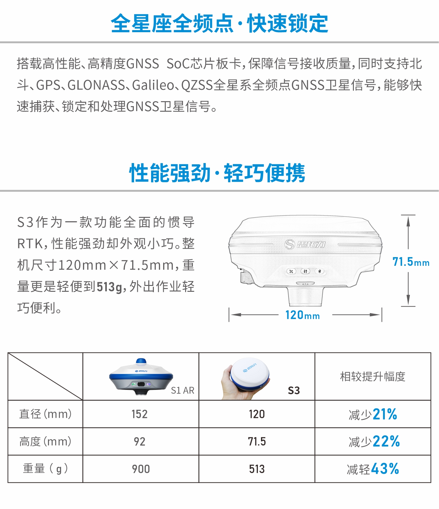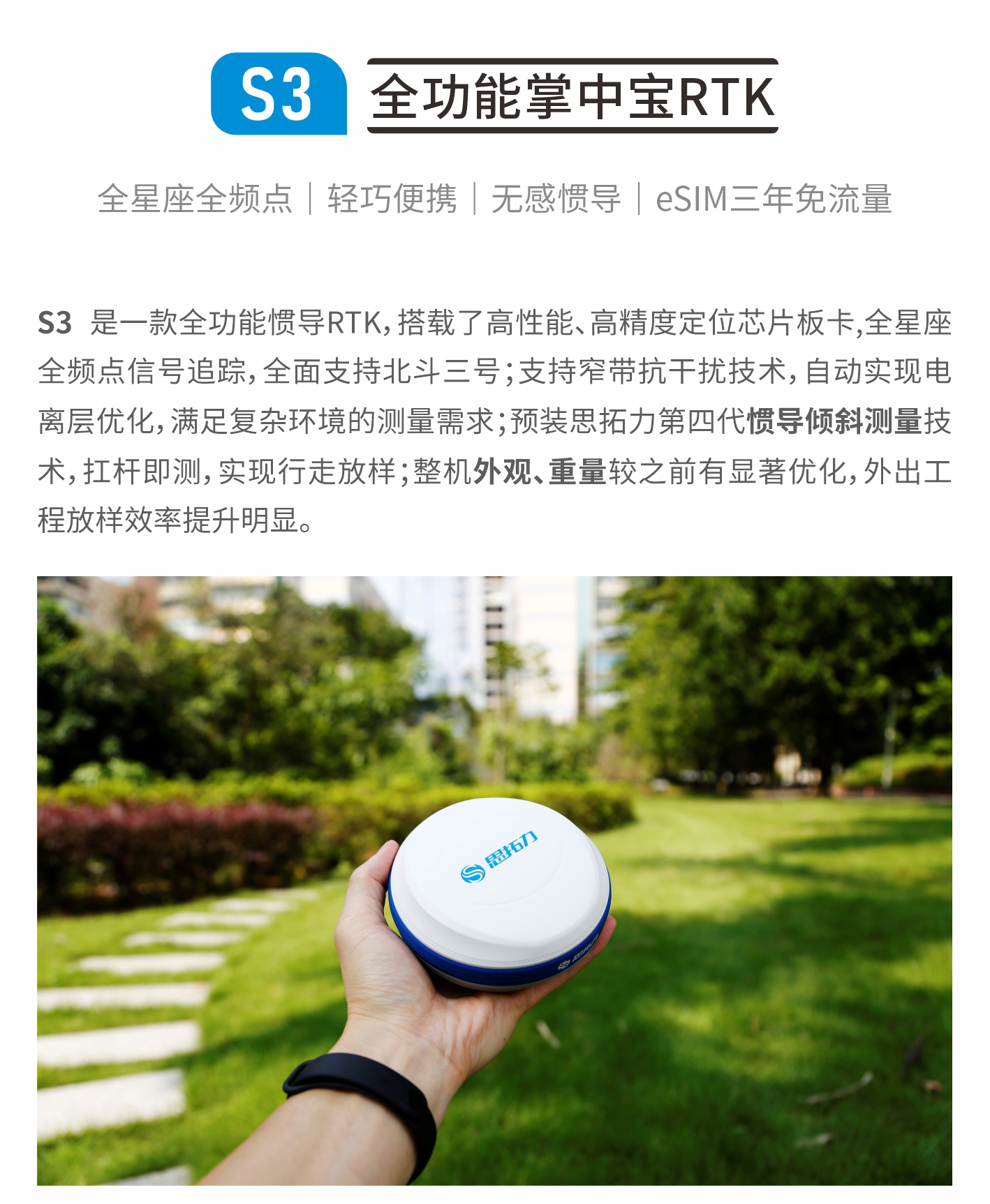 S3 是一款全功能慣導RTK,搭載了高性能、高精度定位芯片板卡,全星座全頻點信號追蹤,全面支持北斗三號;支持窄帶抗干擾技術,自動實現電離層優(yōu)化,滿足復雜環(huán)境的測量需求;預裝思拓力第四代慣導傾斜測量技術,扛桿即測,實現行走放樣;整機外觀、重量較之前有顯著優(yōu)化,外出工程放樣效率提升明顯。