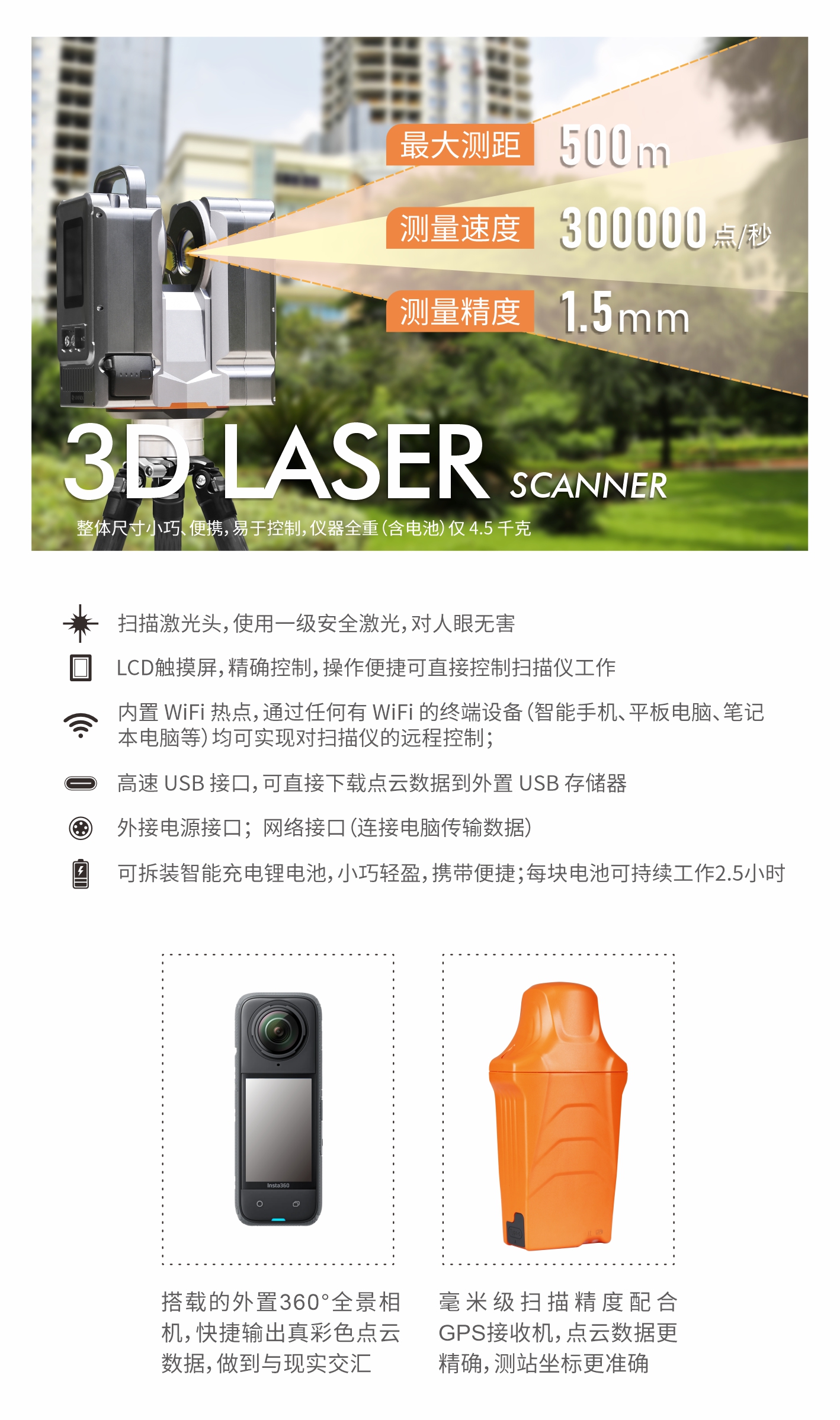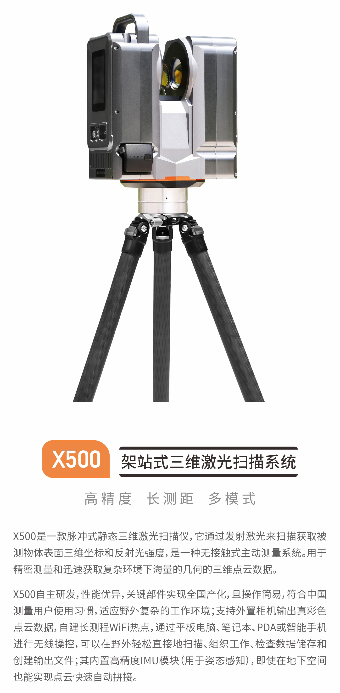 X500是一款脈沖式靜態(tài)三維激光掃描儀,它通過(guò)發(fā)射激光來(lái)掃描獲取被測(cè)物體表面三維坐標(biāo)和反射光強(qiáng)度,是一種無(wú)接觸式主動(dòng)測(cè)量系統(tǒng)。用于精密測(cè)量和迅速獲取復(fù)雜環(huán)境下海量的幾何的三維點(diǎn)云數(shù)據(jù)。