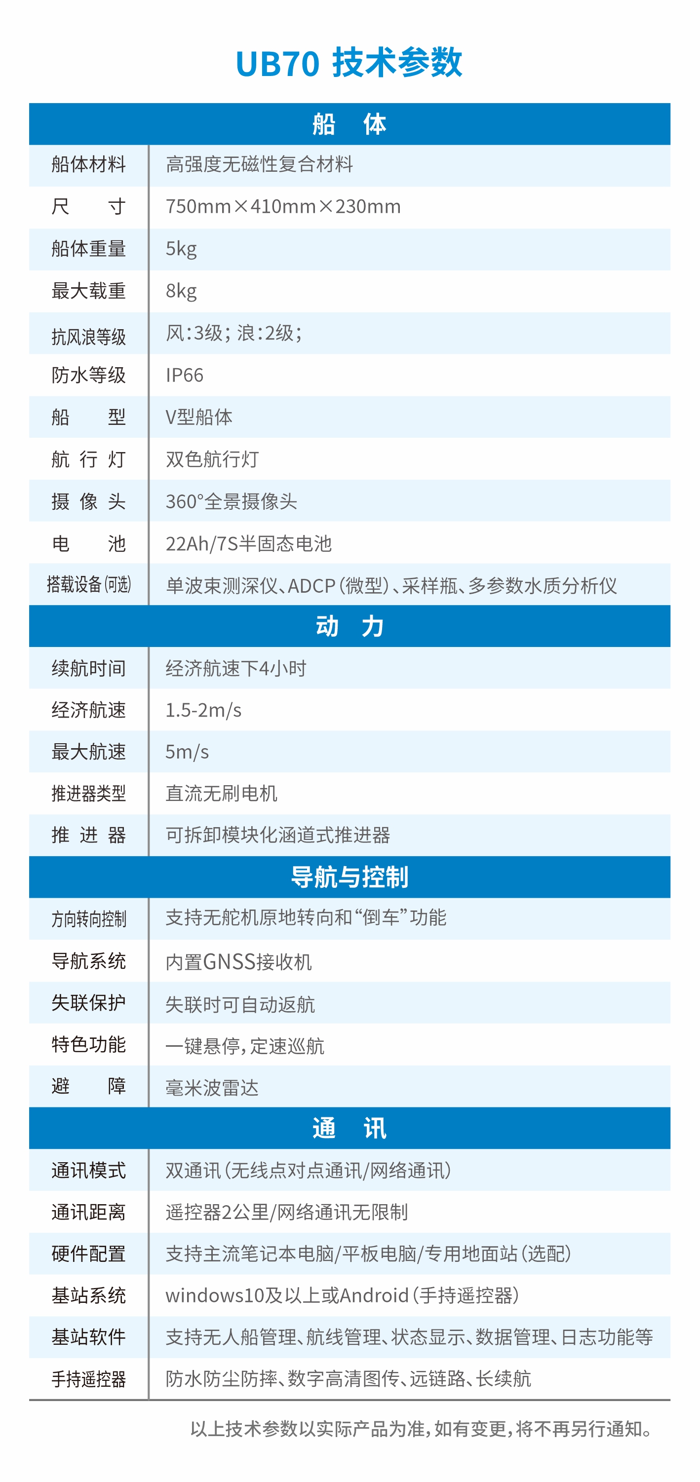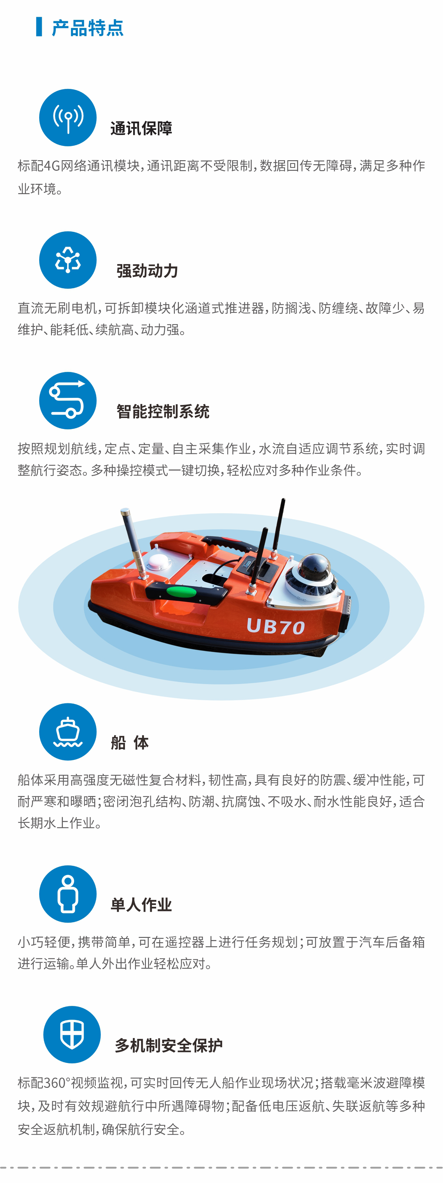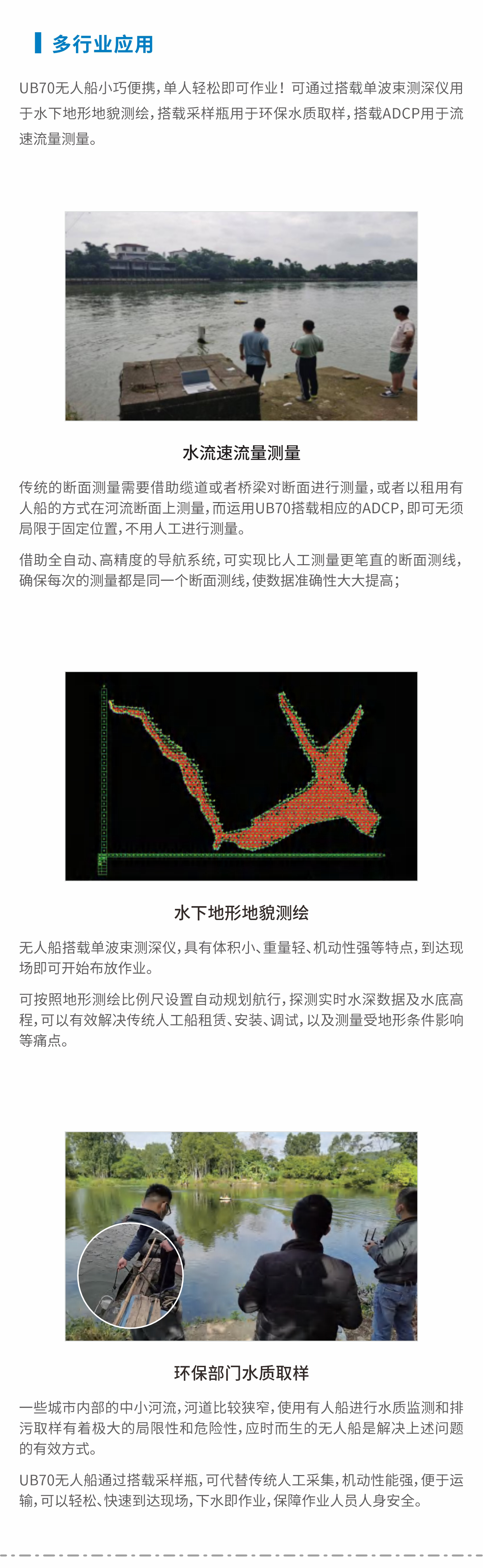 UB70是一款“體積小、強(qiáng)度高、動(dòng)力強(qiáng)、作用大”的小型無(wú)人船平臺(tái),船體高強(qiáng)度無(wú)磁性復(fù)合材料,具有輕便、防震、高韌性等特點(diǎn);通過(guò)搭載單波束測(cè)深儀、采樣瓶、ADCP(微型)、多參數(shù)水質(zhì)分析儀等設(shè)備,可應(yīng)用于水下地形地貌測(cè)繪、水環(huán)境監(jiān)測(cè)、流速流量測(cè)量等領(lǐng)域。